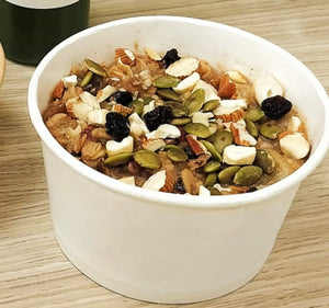 Ingredients: Steel Cut Oats, Roasted Nuts & Seeds (Cashew, Walnut, Pumkin, Black Currants, Figs & Raisins) , Banana, Dates, Cinnamon Powder, Coconut Milk